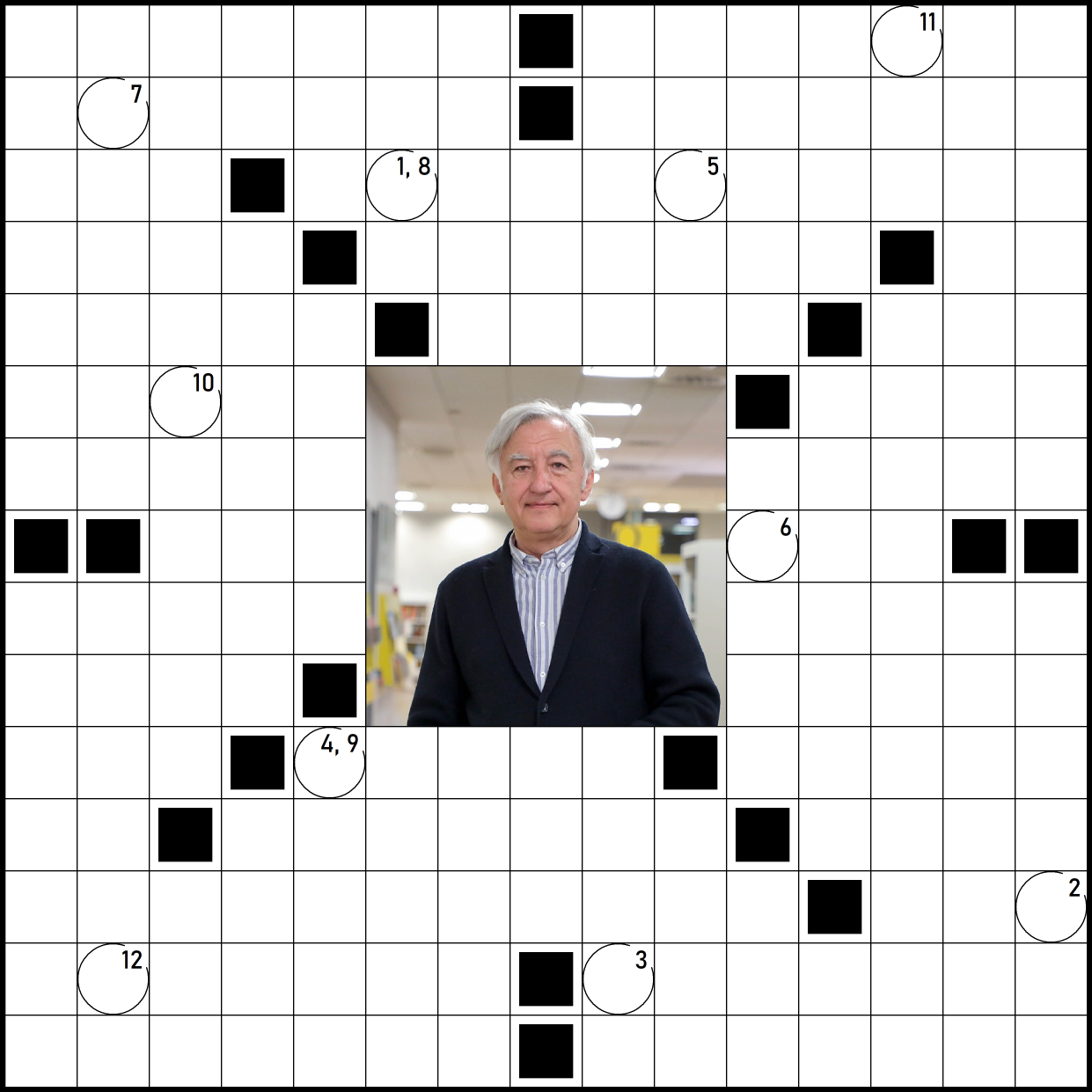 V spodnji lik vnesite spodaj navedene besede, na obkroženih poljih pa boste, če boste prebrali črke s teh polj po vrsti od 1 do 12, dobili ime in priimek slovenskega novinarja (s slike), starosto slovenskega novinarstva, ki za razliko od ostalih (lažnivih) novinarjev korektno poroča o zunanji politiki.